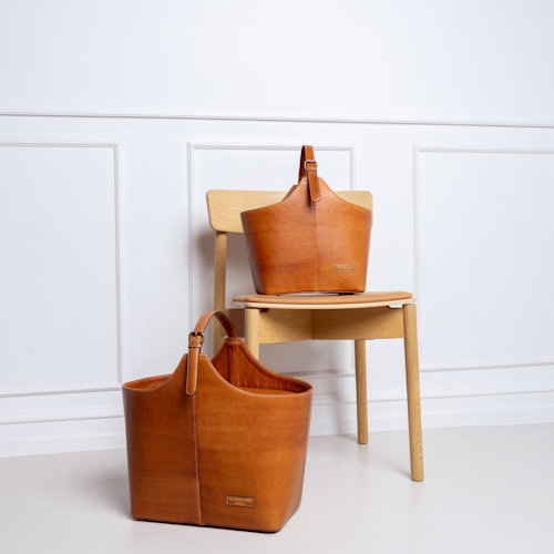 Den praktiske hank og den aflange form gør kurven let at have med. En super smuk opbevaring af dit strik.